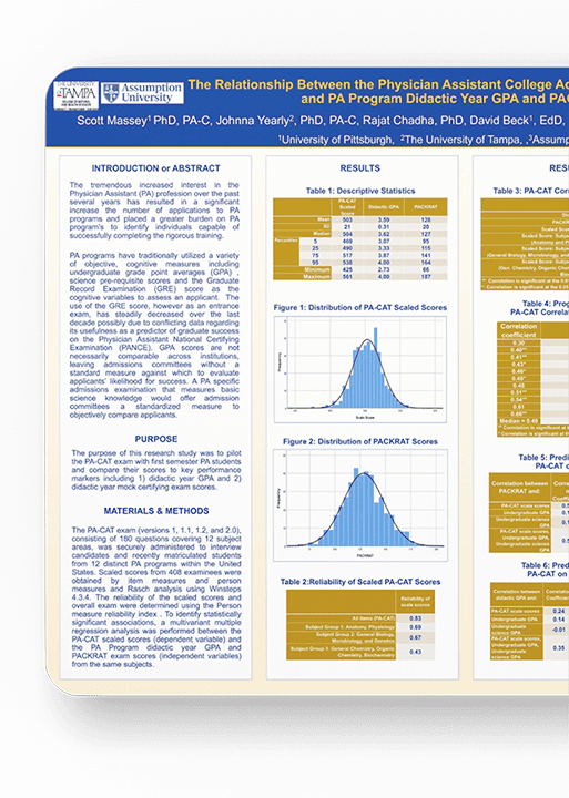 This study sought to determine the correlation between demographics, undergraduate academic performance, and the PA College Admission Test (PA-CAT), a standardized exam developed by Exam Master® Corporation for use in PA admissions.